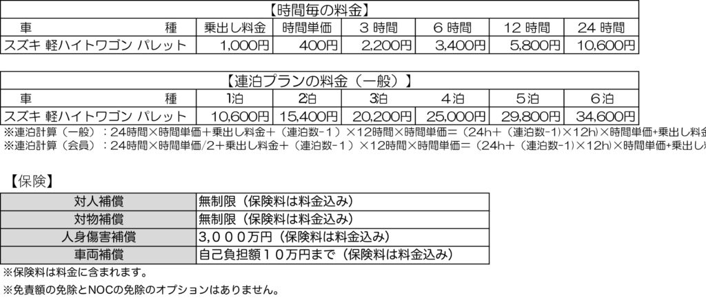 利用料金 (税込) 4人乗・禁煙・オートマ